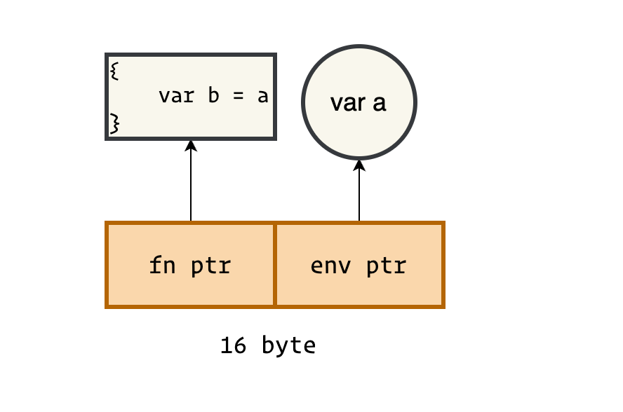 }In high-level programming languages, closures and global functions are typically distinguished. In the example above, when dealing with a fn type variable f, the compiler cannot track whether it's a global function or a closure. A common compromise is to treat all fn type variables as closures for storage and usage. As shown in the diagram, fn isn't a single pointer to the function address—it's a 16-byte pair structure.